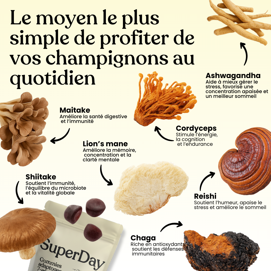 Une façon simple et savoureuse de soutenir votre concentration, maintenir un équilibre énergétique et préserver votre clarté mentale — grâce aux champignons et conçue pour un usage quotidien.